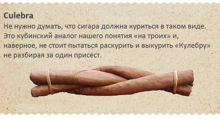 Сигара - монстр – это Culebra. На самом деле она состоит из трех переплетенных сигар, и поэтому требует опыта от курильщика. В большинстве случаев является коллекционной и имеет интересную историю. Раньше рабочие сигарных производств на Кубе имели право на вынос за пределы территории фабрики некондиционные сигары в небольшом количестве. Но кому - то в голову пришла гениальная идея сделать подмену. После того, как руководством было обнаружено, что вместо некондиционных сигар, работники выносят вполне качественные экземпляры, был найден выход. Бракованные сигары начали скручивать по три штуки вместе, это и послужило появлению Culebra.