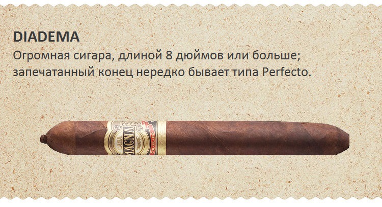«Диадемы» представляют собой довольно крупные сигары, их длина может составлять 8 дюймов и более. Чаще всего они имеют открытую ножку и бантик на шляпке, как у «Перфекто». Но иногда ножки тоже могут быть запечатаны.