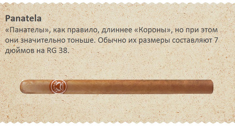 Семейство сигар Panatela - легкие и простые, часто их предпочитают именно женщины, хотя и мужчины редко отказываются. Представлены несколькими разновидностями (Long, Slim, Short, Small), скручиваются, в основном, машинным способом, поскольку требуют особой сноровки от крутильщика.