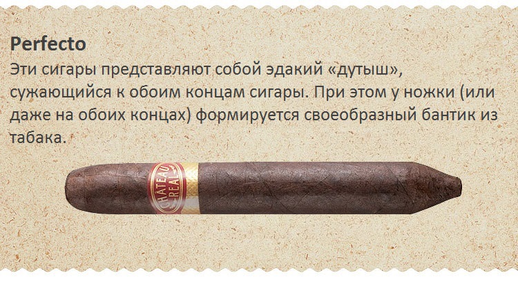 Сужающиеся к концам Perfecto, не симметричны. Часть потолще находится ближе к тому концу, который поджигают. Легкая на начальном этапе процесса курения сигара, раскрывается постепенно и становится глубокой ближе к окончанию курения.