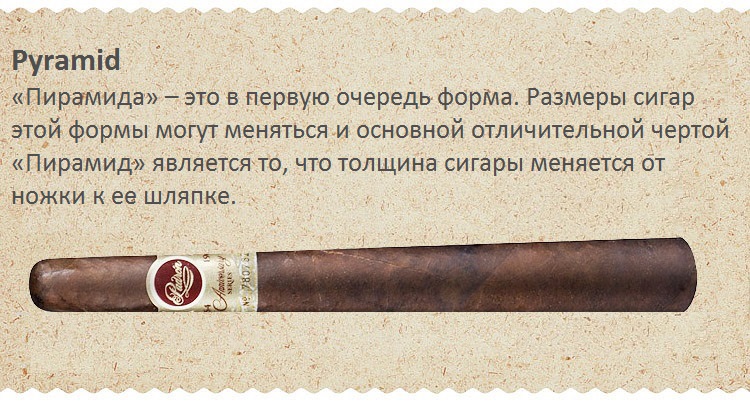 Полностью соответствует своему названию формат Pyramide. Их вкус, так же как и форма (широкие у основания и стремительно сужающихся к кончику), меняется в процессе курения. Вначале курения вкус очень мягкий, но к завершению процесса становится слишком острым.