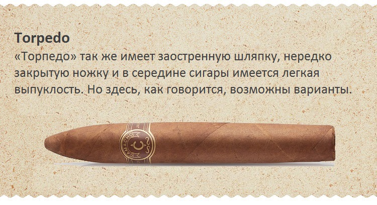 Формат Torpedo яркое подтверждение, что форма, а не размер имеет значение. Сужающиеся к кончику сигары по своему внешнему виду напоминают торпеды. У них очень концентрированный дым, а выкуривание таких сигар оставляет острый привкус во рту.