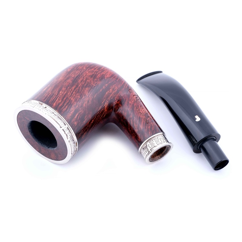 Особое внимание привлекают серебряные кольца (925 проба) на чашке и чубуке, украшенные оригинальным «нотным» орнаментом, придающим трубке художественную выразительность и коллекционную ценность.