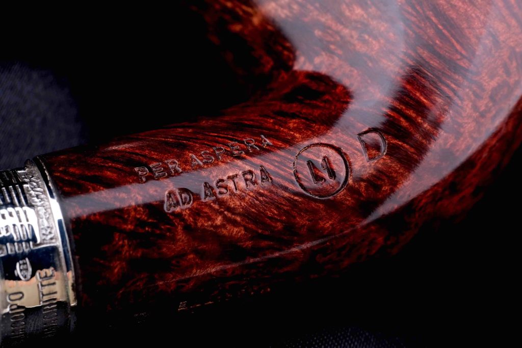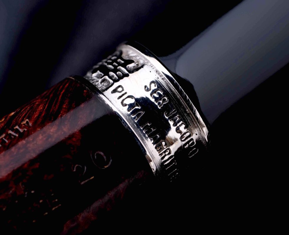 На чубуке выбит фирменный девиз мастерской - PER ASPERA AD ASTRA («Через тернии к звёздам»), а также маркировки: Ser Jacopo, Hand made in Italy, градация L1, серия Picta Magritte и индивидуальный номер трубки.