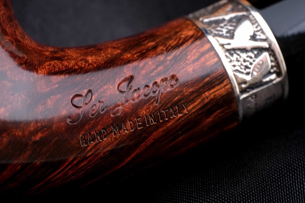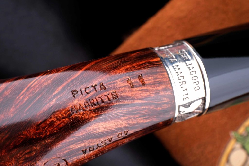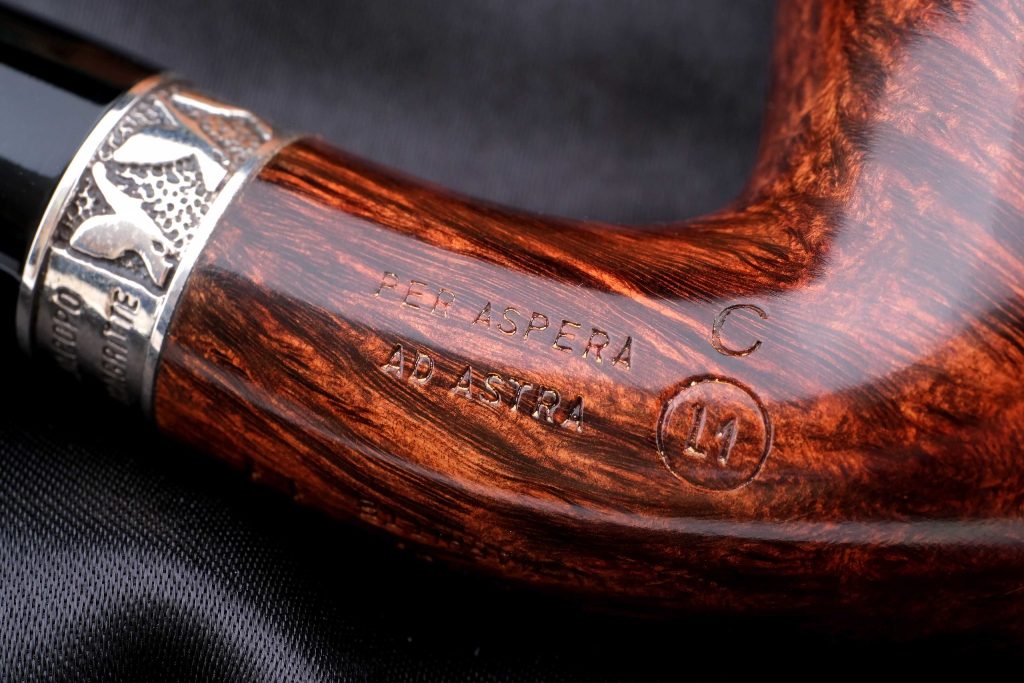 На чубуке выбит фирменный девиз мастерской - PER ASPERA AD ASTRA («Через тернии к звёздам»), а также маркировки: Ser Jacopo, Hand made in Italy, градация L1 C, серия Picta Magritte N11.