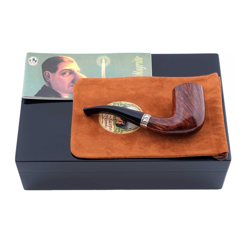 В комплекте: итальянская подарочная шкатулка в чёрном глянцевом лаке, фирменный кисет и буклет Picta Magritte с картинами художника и моделями трубок Ser Jacopo.