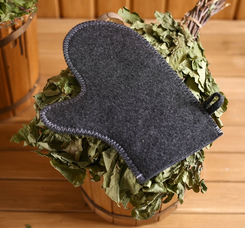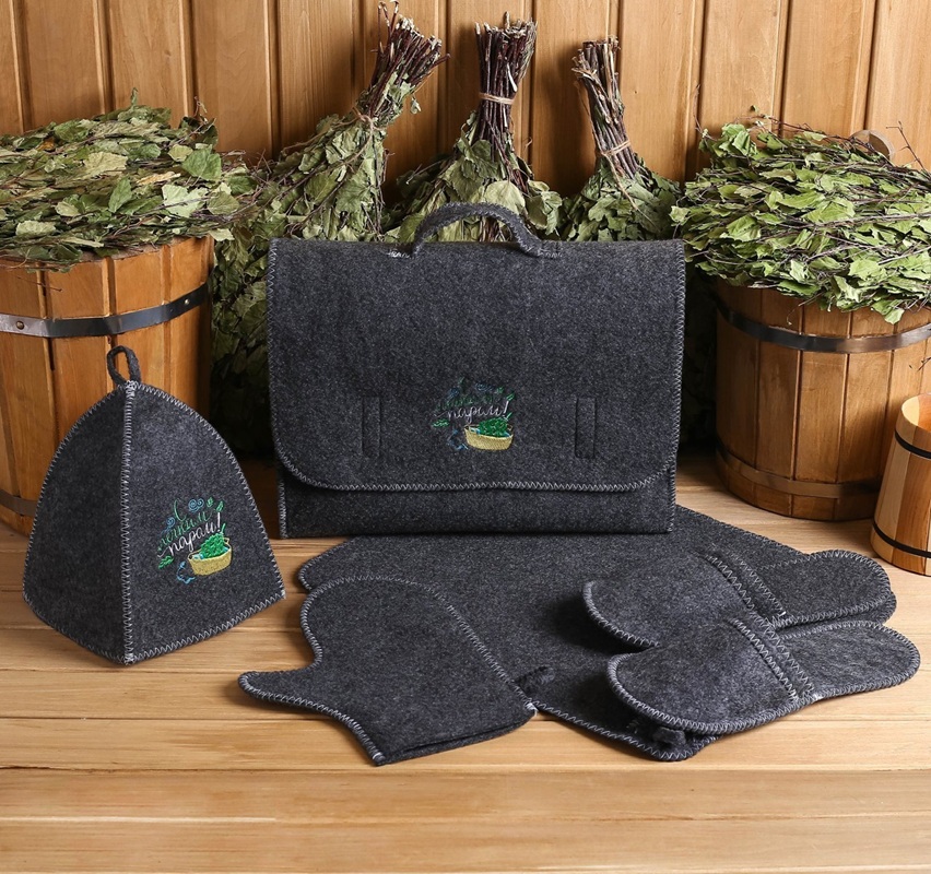 В портфеле можно хранить банные принадлежности и средства личной гигиены. Банная шапка защитит голову от перегрева, волосы от ломкости, а рукавица - от случайных ожогов.Тапочки из войлока и коврик впитывают влагу и сохраняют сухость, что обеспечивает комфорт во время посещения парной.