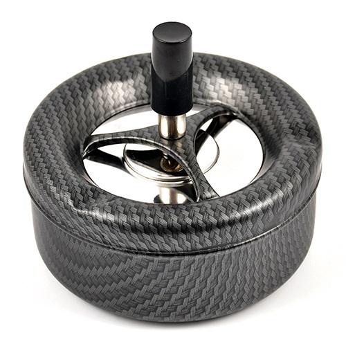 Пепельница металлическая, при нажатии на ручку, верхняя пепельница опускается с одновременным вращением и за счёт центробежной силы освобождается от пепла и окурков, которые попадают в нижнюю более вместительную пепельницу.