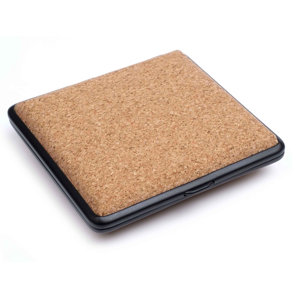 Корпус из металла с черненой рамкой и наружной отделкой из натуральной пробки, сохраняющей приятое тактильное ощущение как на морозе, так и в жаркую погоду. Легкое открывание одним нажатием благодаря подпружиненным петлям.