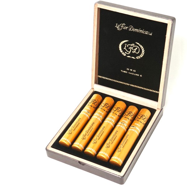 La Flor Dominicana Oro Tubo № 6 Maduro поставляется в золотых алюминиевых тубах в коробках по 5 штук.