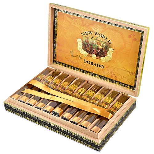 Новая версия сигар New World - Dorado отличается тёмно-золотистыми цветами и полностью изготавливается из никарагуанского табака, большая часть которого поступает с фермы компании Dorado в Эстели.Покровный лист Habano Sun Grown, начинка производится на фабрике San Lotano в Окотале.Начальные затяжки сливочные, с нотками цитрусовых, далее добавляются пряные ноты орехов и кожи.Скрутка: ручная.Формат: Toro.Производитель: Республика Никарагуа.Покровный лист: Habano Sun Grown, Никарагуа.Связующий лист: Никарагуа.Начинка: Никарагуа.Размер: 152 x 21.4 мм (RG54).Индивидуальная упаковка: целлофан.Крепость: выше средней.Количество в коробке: 10 шт.