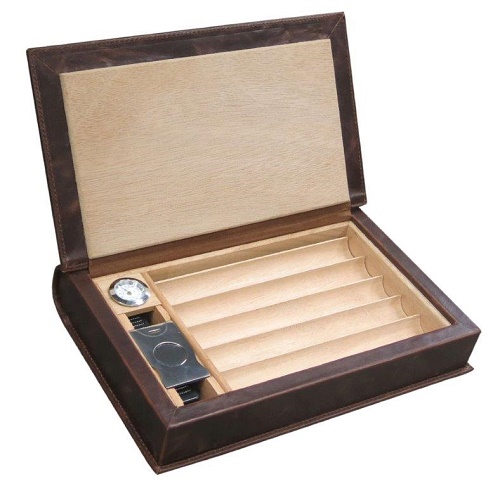 В комплект хьюмидора входят лоток на 5 сигар, увлажнитель, аналоговый гигрометр и металлическая гильотина.