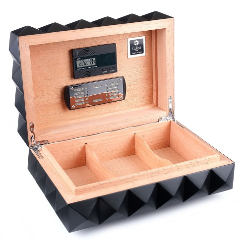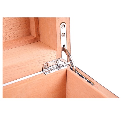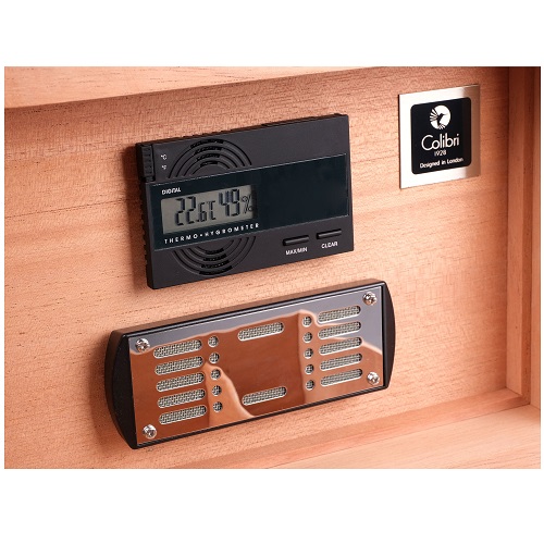 В комплекте с хьюмидором идут высокоточный электронный термогигрометр и увлажнитель, крепящиеся в любом месте на крышке благодаря скрытой под кедровым шпоном магнитной пластине.