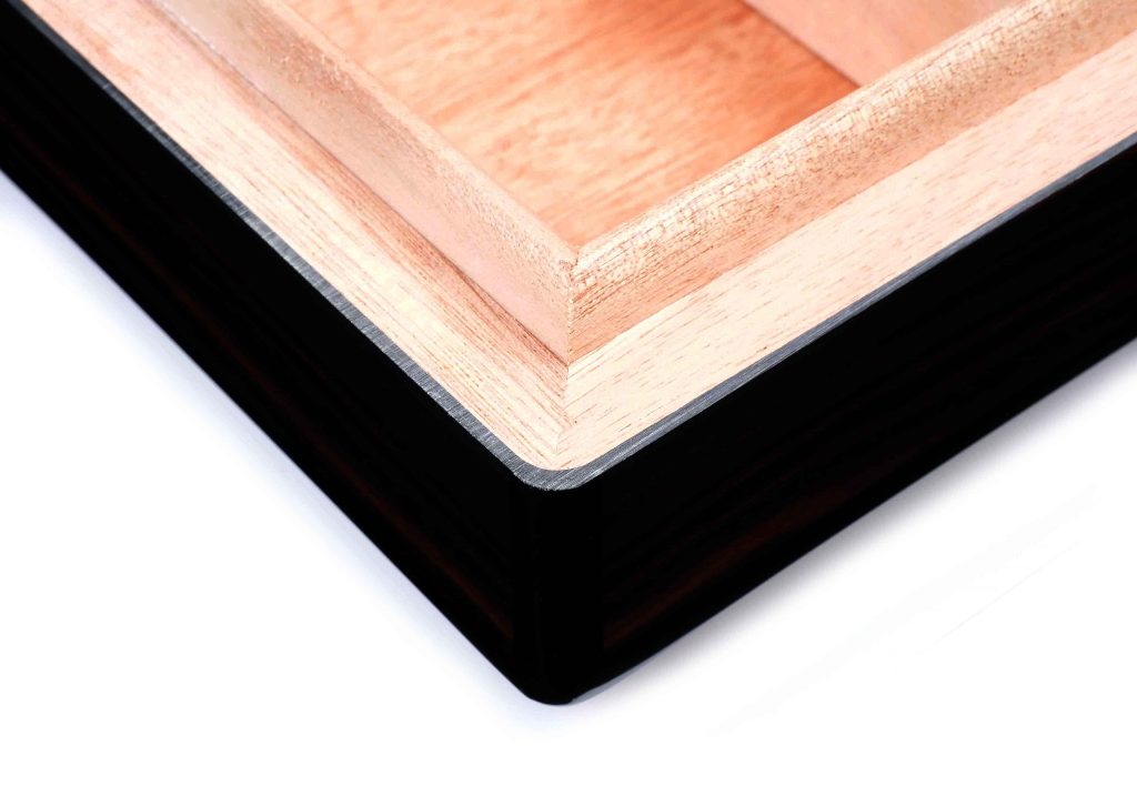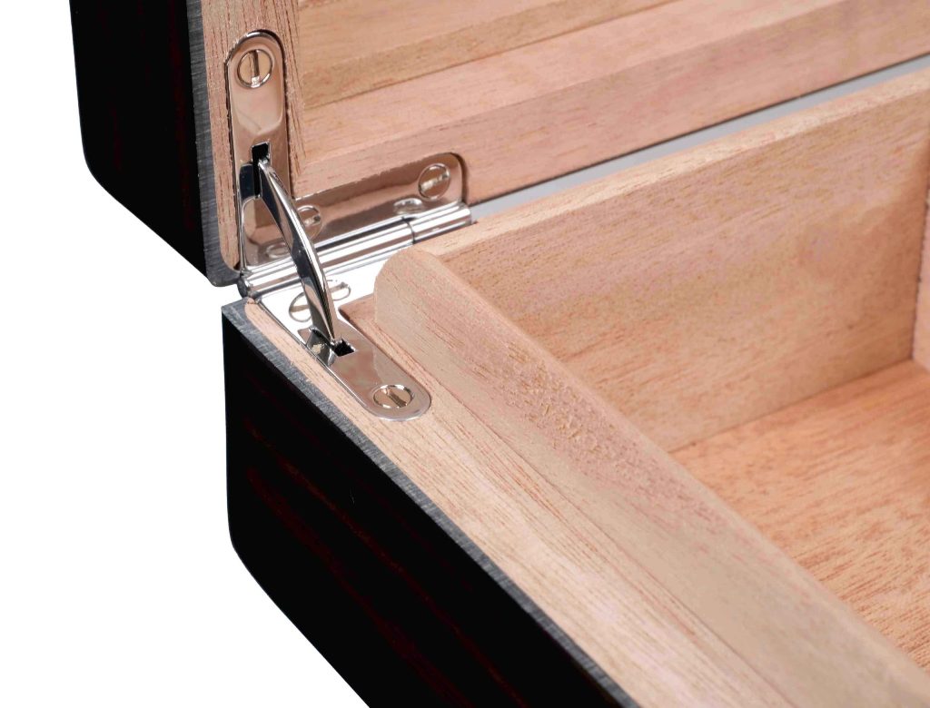 Внутреннее пространство облицовано испанским кедром, который поддерживает оптимальный микроклимат и способствует правильному хранению сигар. Корпус выполнен с отделкой из натурального шпона макассара и покрыт многослойным глянцевым лаком, подчёркивающим выразительную текстуру древесины и обеспечивающим дополнительную защиту.
