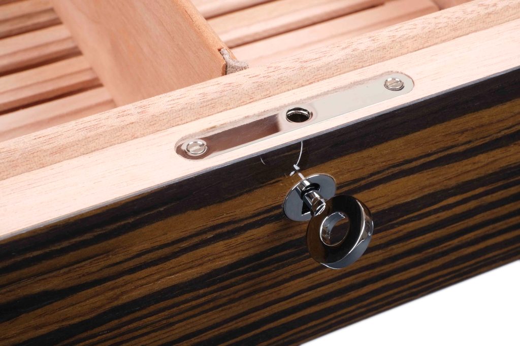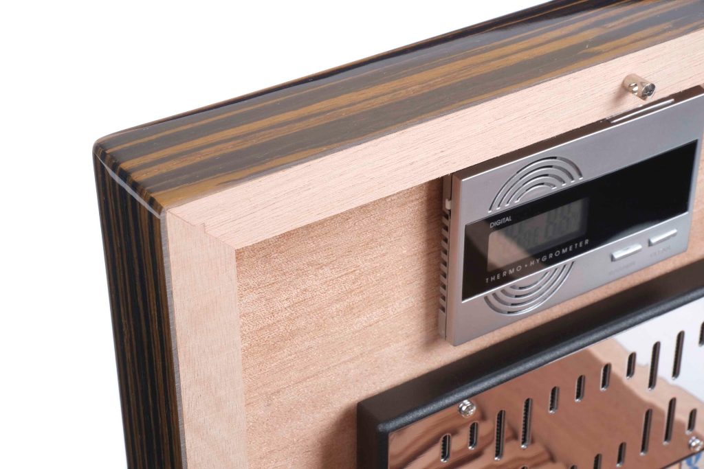 На дне расположена съёмная кедровая решётка, обеспечивающая равномерное распределение влаги и эффективную циркуляцию воздуха по всему объёму хьюмидора. В комплект входят увлажнитель, высокоточный электронный термогигрометр, замок с ключом и подробная инструкция по эксплуатации. Также предусмотрены тканевый чехол и подарочная коробка.