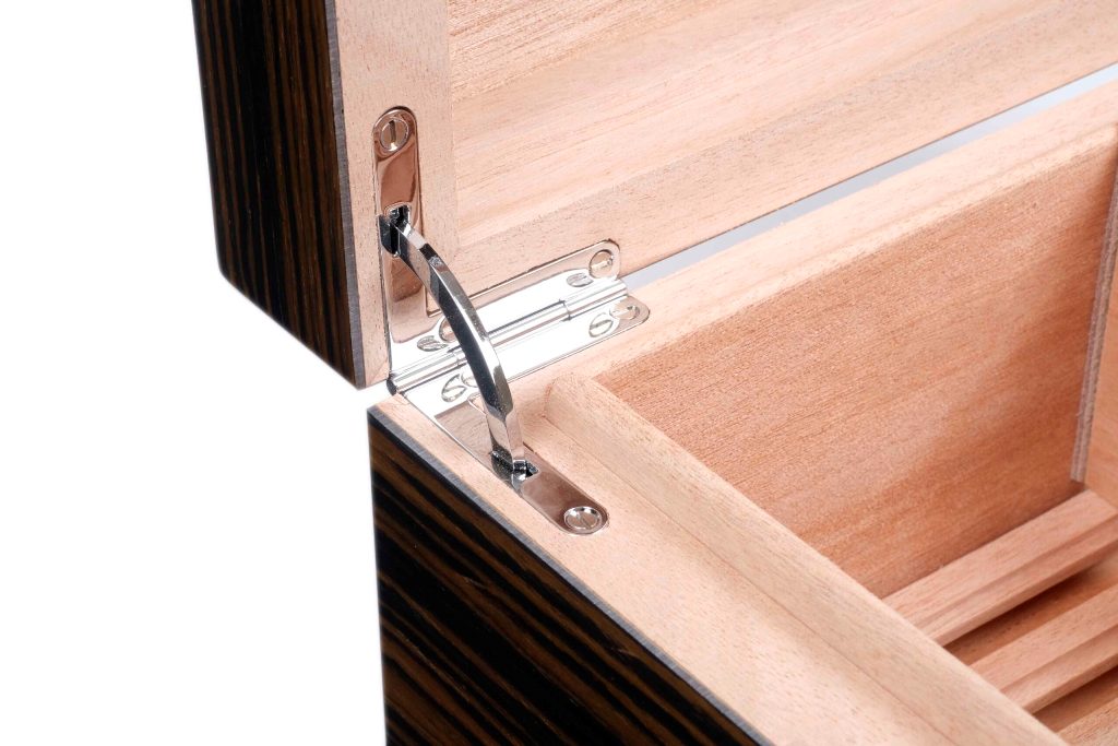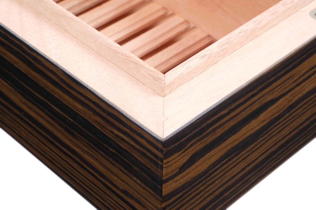 Корпус отделан натуральным шпоном эбенового дерева (Ebony) из Экваториальной Африки и покрыт многослойным глянцевым лаком, который подчёркивает выразительную текстуру древесины и обеспечивает дополнительную защиту поверхности. Внутреннее пространство выполнено из испанского кедра, способствующего поддержанию стабильного микроклимата и правильному хранению сигар.