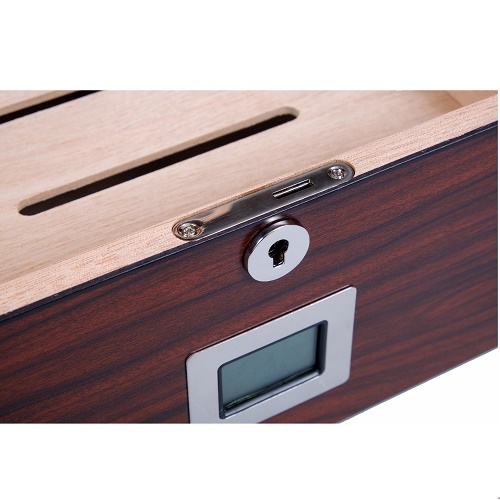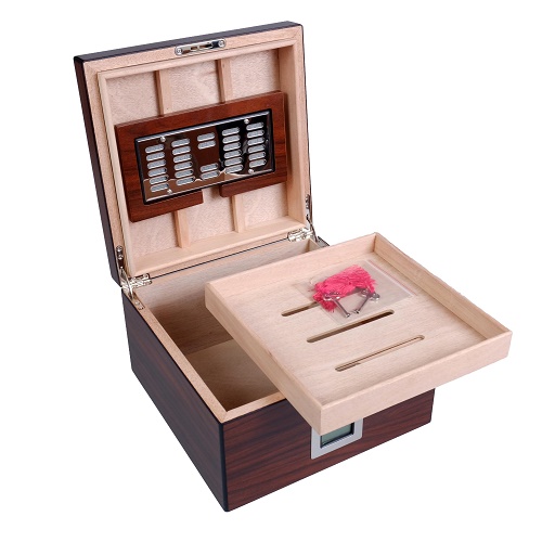 В комплекте увлажнитель, электронный термогигрометр, лоток и съемная перегородка для сигар, замок с ключом, инструкция по уходу.