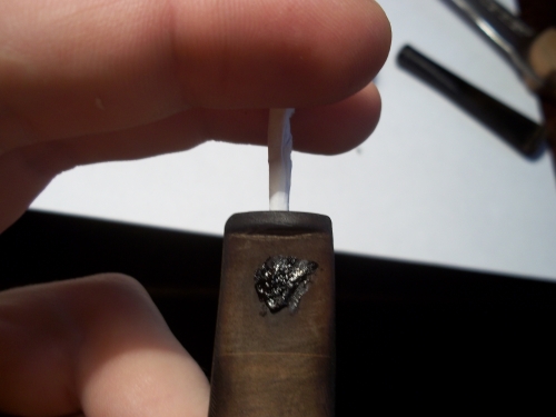 ![]() Я не буду здесь показывать, как я мыл мундштук ершами с мылом. Это просто неэтично... Прокушенный мундштук - не беда! Запаяем! Вот, что для этого нужно: ![]() Сначала вставим в мундштук свернутую бумажку, чтобы дымканал не запаять. ![]() Теперь поехали. Расплавляем эбонит на свечке и замазываем дыру. ![]() И не забываем шевелить бумажку, чтобы не прилипла.